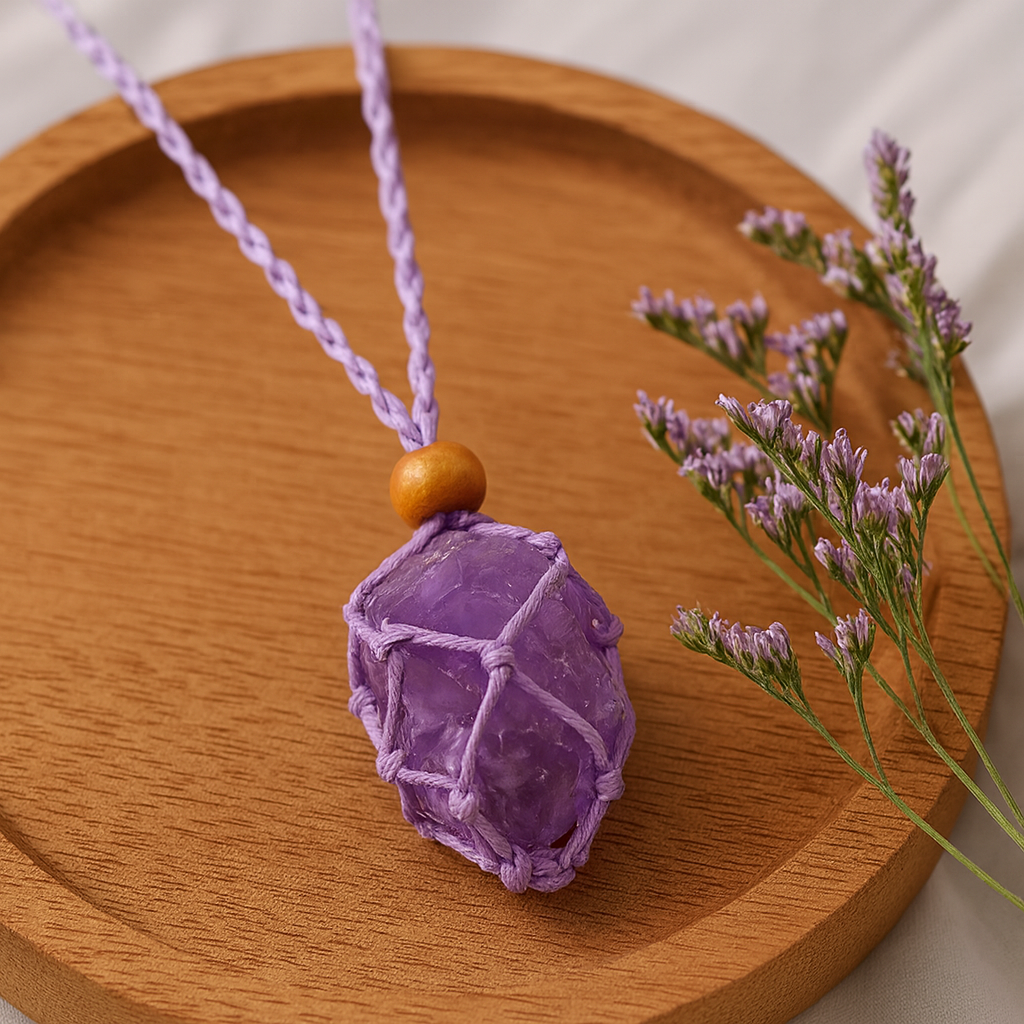 Неровная, полупрозрачная поверхность камня ловит свет с мягкими переходами оттенков. Тонко завязанный макраме-сетчатый узор того же светло-фиолетового цвета образует ромбовидную решётку, которая надёжно удерживает камень, а гладкая натуральная деревянная бусина добавляет тёплый, земной акцент. Шнур регулируется для плотного прилегания к шее или более длинного спуска, а дизайн без металла сохраняет акцент на текстуре, цвете и комфорте. 🌿