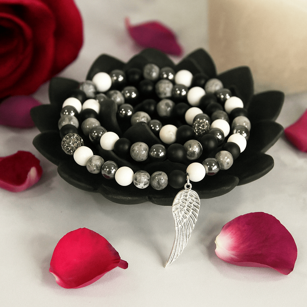 Агат ценился веками за свою слоистую красоту и прочность, часто его хранили как напоминание о стойкости, балансе и личной силе. Здесь серые мраморные бусины с естественными прожилками сочетаются с глубоким матовым черным, гладким белым, темным металлическим блеском и несколькими акцентами с паве — продуманное сочетание текстур, которое кажется современным и в то же время приземленным. Серебристое крыло добавляет ясный символический акцент: во многих культурах крылья означают руководство, защиту и память — нежный символ заботы, стойкости и связи.