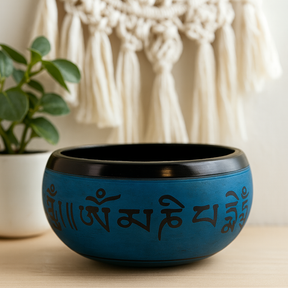 Поющая чаша диаметром 16 см с округлой, открытой формой лежит прохладной и сбалансированной в руках. Её матово-синий корпус украшен мантической надписью, внутренняя часть тёмная и отражающая. Это сосуд звука, который успокаивает ум и центрирует дух. 🧘