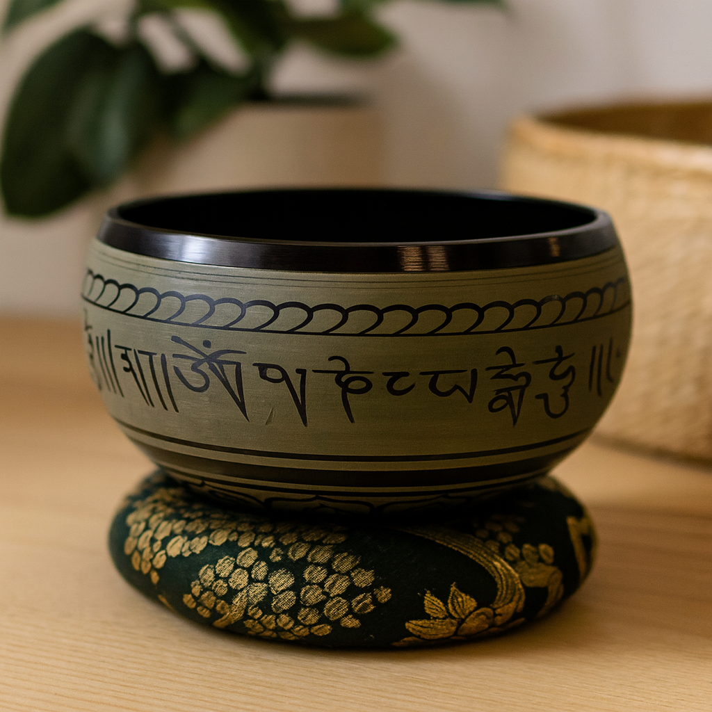 Chladná váha kovu spočíva v dlani; tmavý, leštený okraj sa stretáva s brúseným, zelenkavým vonkajškom zdobeným písmom. Táto spievajúca misa je nádobou zvuku — stabilná, priestranná a upokojujúca — vytvorená na zhromažďovanie mysle a stred duše. 🔔🕊️
