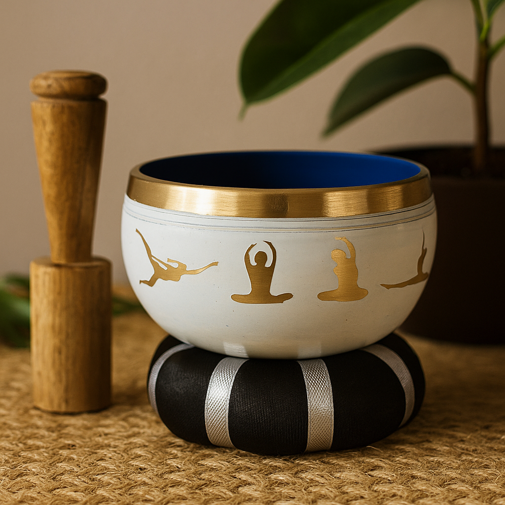 Kovová misa nesie jasný, rezonantný hlas, podporený mosadzným okrajom pre hladké spievanie na okraji a pokojným modrým vnútrom proti matnému striebornému vonkajšku. Po obvode vonkajšej strany zlatý pás s posediačkami meditačných postáv ponúka tichú pripomienku všímavosti a súcitu — motív bežne spájaný s Budhom v mnohých tradíciách, kde je uchovávaný v domovoch a priestoroch na prax ako symbol vnútorného pokoja. 🧘