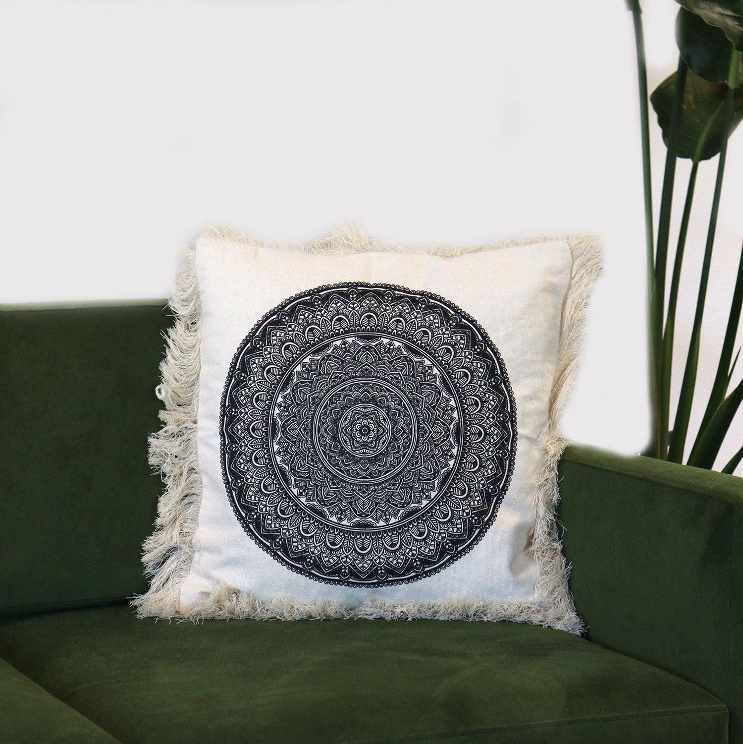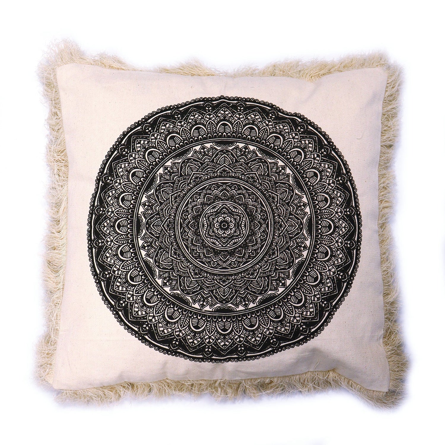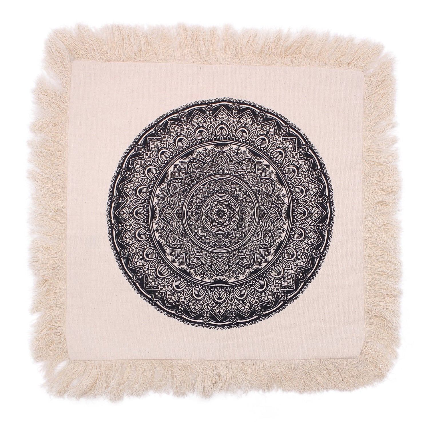 Uprostred prednej strany sa rozvíja vysoko kontrastná čierna mandala v sústredných kruhoch s oblúkmi, okvetnými lístkami, bodkami a čipkovanými detailmi. V mnohých tradíciách sú mandaly symbolmi rovnováhy a celistvosti, často používané ako jemný vizuálny kotviaci bod pre všímavosť v každodenných priestoroch. Vyrobené v Indonézii, ostré umelecké dielo sedí na dotykovej tkanine, zatiaľ čo celoplošný okraj so strapcami zjemňuje siluetu po naplnení.