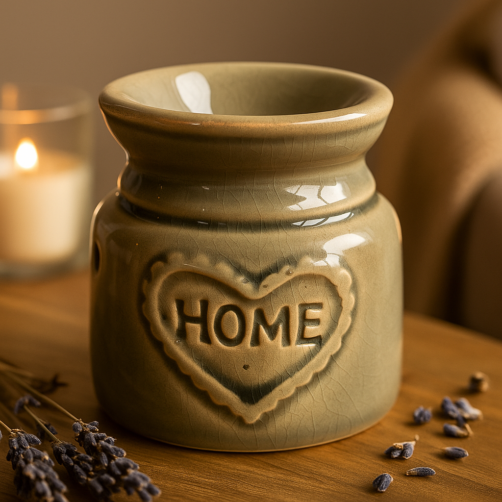 Na použitie naplňte plytkú hornú misku vodou a pridajte niekoľko kvapiek esenciálneho oleja, potom umiestnite čajovú sviečku pod ňu cez bočný otvor. Jemné teplo uvoľňuje vôňu rovnomerne; lesklý povrch odráža jemný lesk, zatiaľ čo bylinné, citrusové alebo kvetinové tóny sa vznášajú priestorom. Ak chcete, môžete do suchej misky vložiť voskovú náplň. Na prednej strane je vyrazené srdce so slovom "HOME", ktoré jednoducho ctí starostlivosť a príslušnosť — malá pripomienka tepla a pohostinnosti v každodennom živote. 🌿