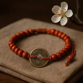 Stredný prívesok odráža tradičnú čínsku mincu: okrúhly tvar pre nebo so štvorcovým otvorom pre zem. Historicky používaná ako mena v Číne, štvorcový otvor umožňoval bezpečné navliekanie mincí; vo feng shui sa tento motív často uchováva alebo nosí ako pripomienka harmónie, vyvážených zdrojov a uvedomelej prosperity. Oranžová šnúrka pridáva teplý, vítajúci tón, zatiaľ čo drevené korálky udržiavajú pocit ukotvenia.