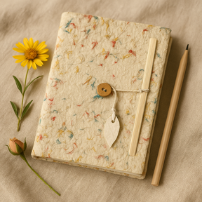 Lokta papier má dlhú tradíciu v Nepále, kde sa vyrába z kôry kríka Daphne a je cenený pre svoju pevnosť a trvácnosť. Jeho jemná textúra dodáva charakter náčrtom, poznámkam a listom, zatiaľ čo obal z recyklovaných bavlnených vlákien – posiaty červenými, zelenými a žltými škvrnami – pridáva tichú farbu a teplo. Každý zápisník sa mierne líši, čo je malým dôkazom jeho ručnej výroby.