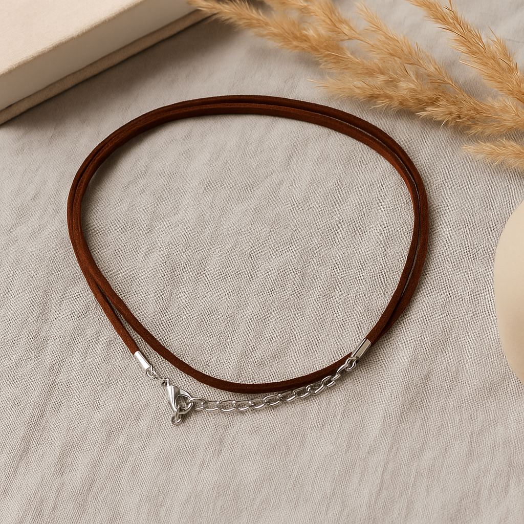 Pripravený na nosenie, so strieborným kovaním: karabínka, predlžovací reťazec z malých, rovnomerných očiek a pekné kovové koncovky pre bezpečné zakončenie. Jednofarebný odtieň ticho ladí so striebrom, zlatom, mosadzou, drevom alebo kameňom, nechávajúc váš kúsok v popredí. 🔗