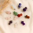 Vyrobený z mixu polodrahokamu a minerálov pripomínajúcich sklo, každý prívesok ukazuje svoj vlastný charakter: hladký a lesklý, v odtieňoch od jemnej ružovej a sviežej zelenej po hlbokú červenú, číre a mliečne opalescenčné biele/modré, nočné modré s bledými pruhmi a teplé hnedé s zlatými pásikmi. Niektoré kúsky sú priehľadné, iné jemne nepriehľadné; všetky sú dokončené strieborným očkom pre jednoduché nosenie. Malý rozmer, pohodlný na každodenné nosenie — na retiazke, pripnutý na kľúčenke alebo ako prívesok.