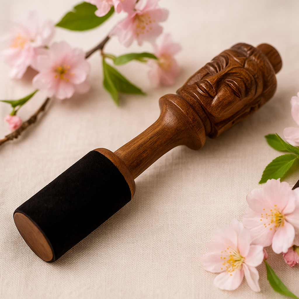 Teplé, leštené drevo sa stretáva s dlaňou; čierne obalená hlava sa stretáva s bronzom. Tento 14 cm palička je tichým mostom medzi rukou a zvukom, vedúcim vašu spievajúcu misku do plnej rezonancie. Vyrezávaný reliéf—zobrazuje pokojného Budhu medzi geometrickými motívmi—poskytuje pevný, hmatový kotviaci bod pre palec. 🔔