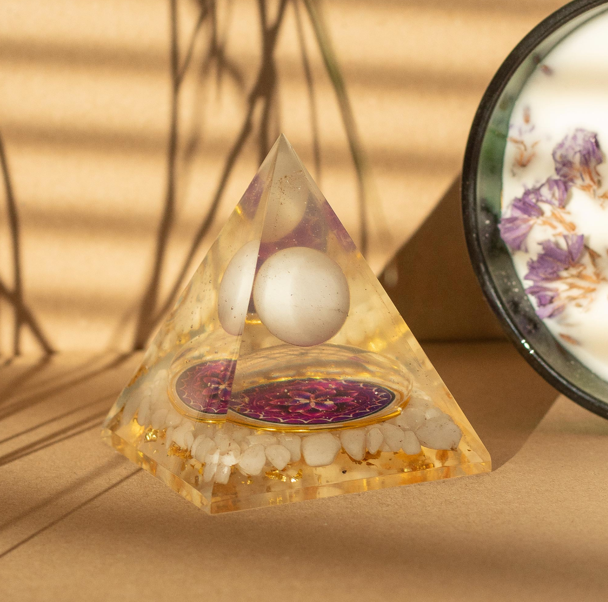 - Každá pyramída je ručne vyrobená jednotlivo, takže presná poloha gule, veľkosť a usporiadanie kúskov kremeňa a priehľadnosť živice sa môžu líšiť kus od kusu.