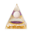 Stredne veľká orgonitová pyramída s rozmermi približne 7 cm na šírku a 6 cm na výšku, s leštenou kremeňovou guľou zavesenou vo vnútri živice a kúskami kremeňa vrstvenými v základe.