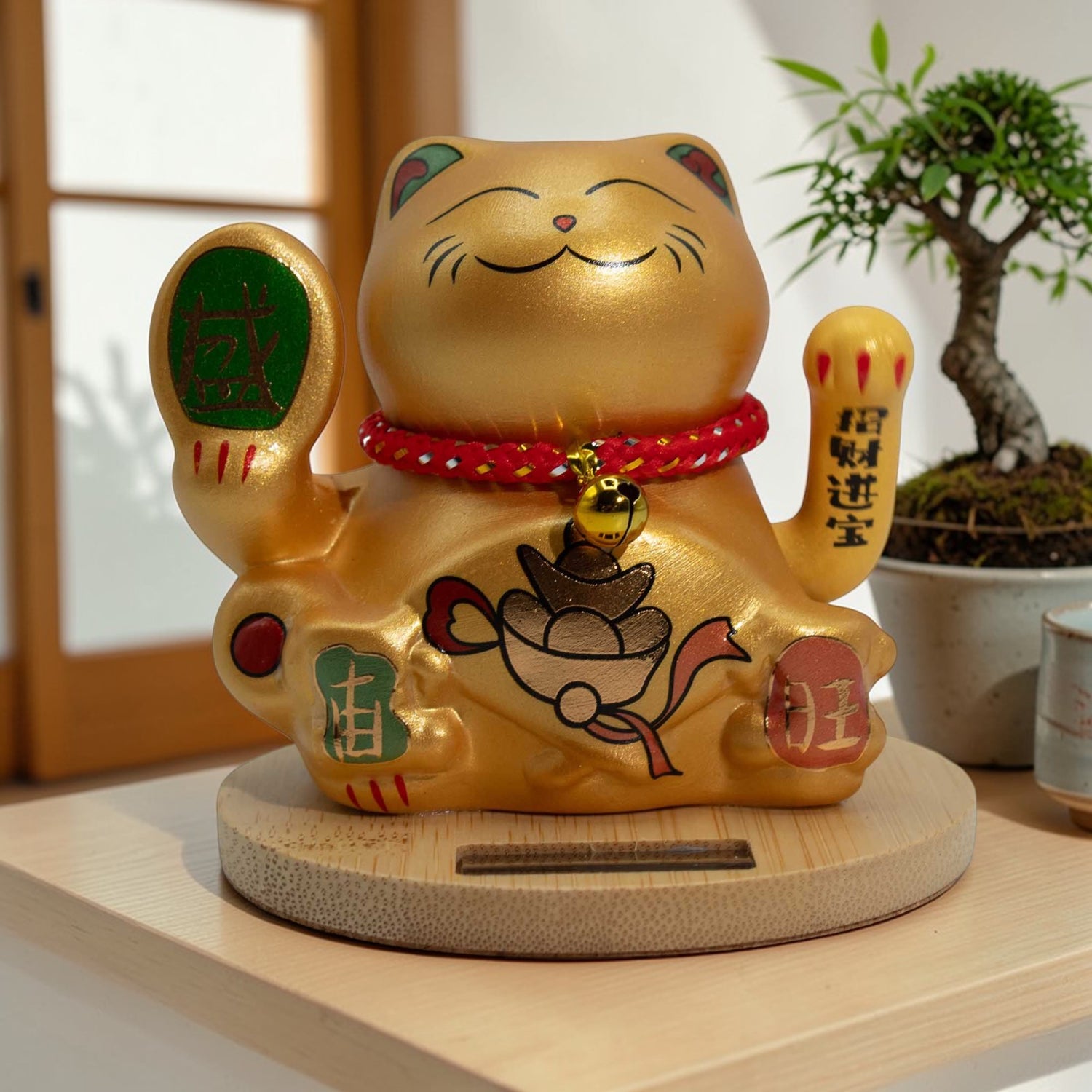 Solárne napájaná zlatá mačička šťastia na drevenom podstavci, s mávajúcou rukou, ktorá sa aktivuje na svetle — najviac prosperitou spojená farebná varianta v rade solárnych mačičiek, nevyžaduje batérie.