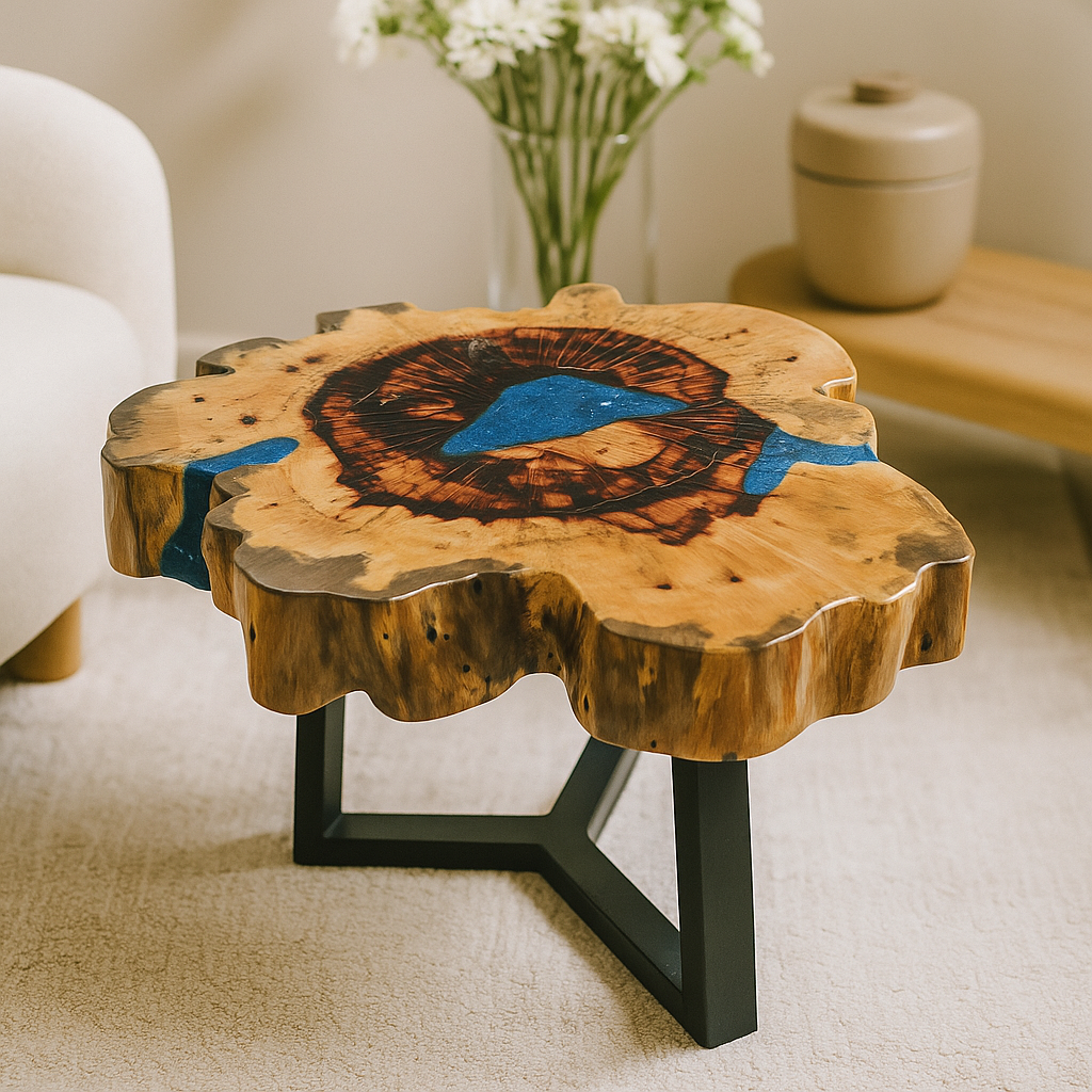 Štruktúra tamarindu pôsobí chladivo a pevne pod rukou; medzi jeho kontúrami spočíva nebesky modrá stužka živice ako tichá voda. Nízky a ukotvený, usadzuje sa v miestnosti ako tiché srdce každodenných rituálov – ranná káva, nerušený rozhovor, kniha položená s náležitou starostlivosťou. ☕🌊
