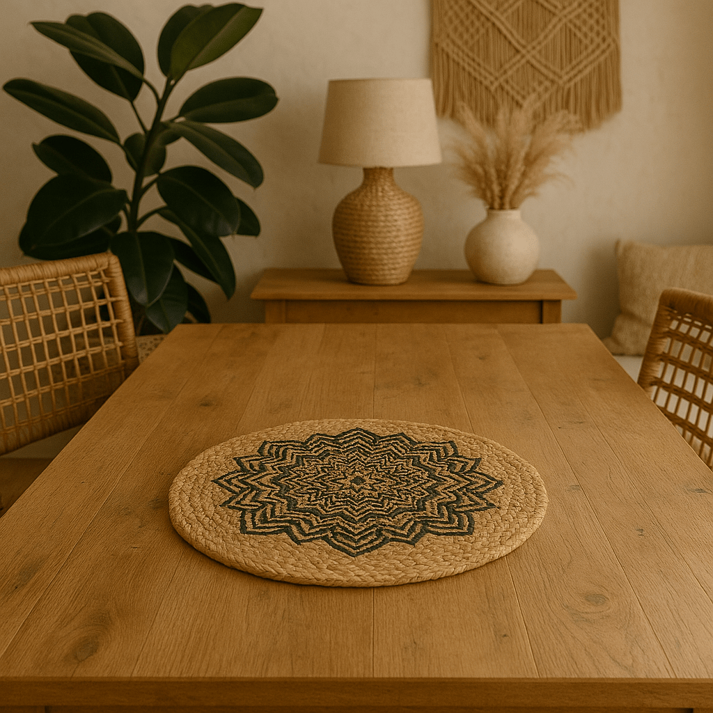 Ringlad jute ger en lugn, taktil närvaro till bordet, skyddar ytor samtidigt som den tillför tyst karaktär. Den naturliga tanfärgade flätan ligger platt och stadigt, inramad av en ren cirkulär kant, med ett mjukt svart mandalamönster som centrerar dukningen och drar blicken till sig. 🌿