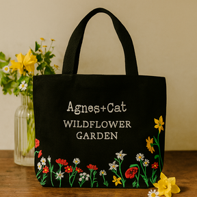 Den svarta basen skapar en jordad bakgrund för delikat trädgårdsbroderi längs nederkanten — gröna stjälkar med röda, vita och gula blommor — en liten färgfest som förblir elegant. Två långa, platta axelremmar sitter bekvämt, och den rektangulära formen erbjuder generöst utrymme för dagens nödvändigheter, från marknadsfynd och en anteckningsbok till en lätt scarf. Framsidan inkluderar orden "Agnes + Cat" och "WILDFLOWER GARDEN," en mild nick till motivet. Den viks platt när den inte används, öppnas brett vid behov och bärs vackert vid upprepad användning — pålitlig, okomplicerad och tyst charmig.