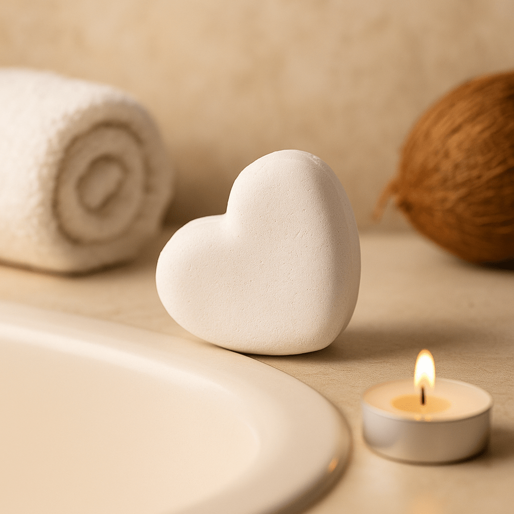 Kall och slät i din handflata, ett rundat hjärta med en mjuk, matt yta och stenslik ro. Sänk ner det i varmt vatten och lyssna när det börjar bubbla—milt, stadigt, fridfullt. En tyst vårdrutin med en krämig viskning av kokos. 🤍