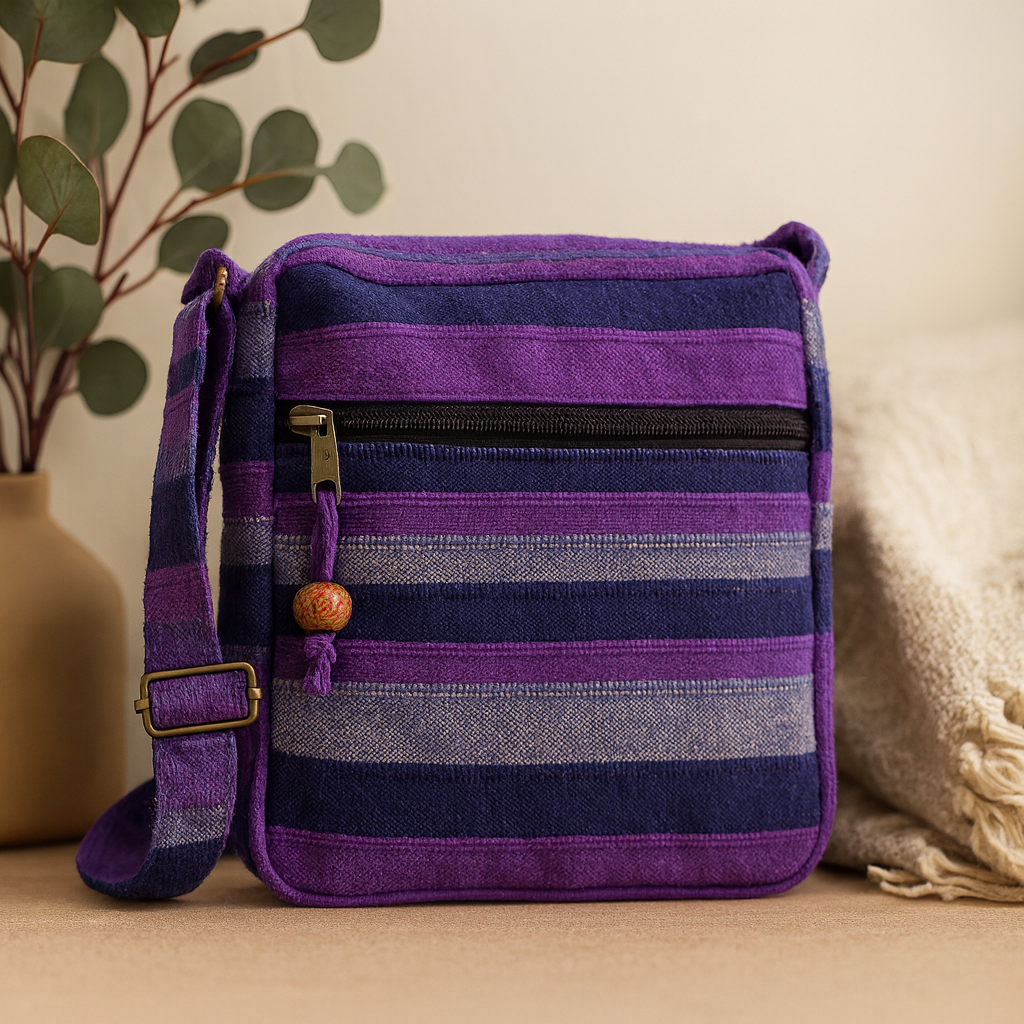 - 🧵 Texturerad väv: Lättviktsvävt tyg med horisontella ränder i blått, lila och grått.