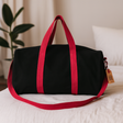 Mjuk och strömlinjeformad, denna barrel duffel förenar form och enkelhet. En djup svart kropp med rundade ändar ramas in av körsbärsröda vävda handtag som löper längs sidorna, med en justerbar axelrem och silverfärgade detaljer som håller utseendet rent och genomtänkt. 🧳