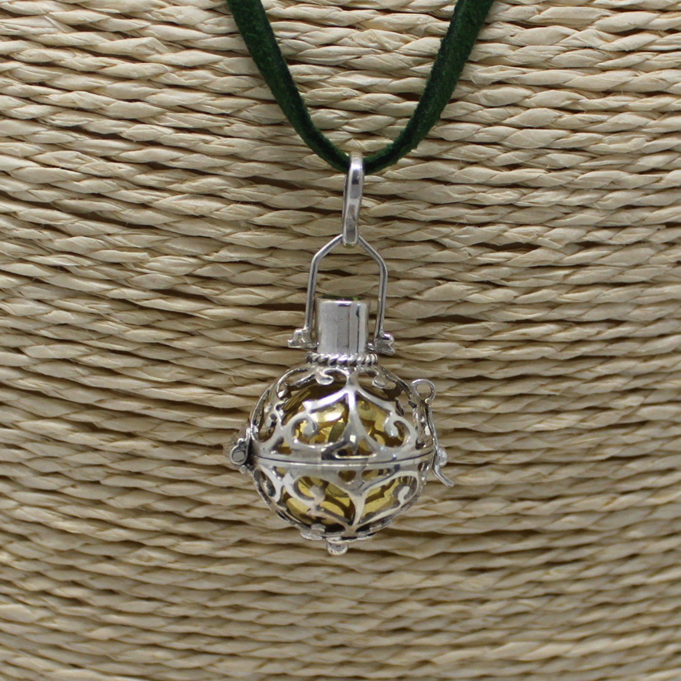 Tillverkad i 92,5 sterlingsilver är hängsmycket en 18 mm filigransfär med graciösa scroll- och blomster-motiv, polerad till en tyst glans. Genom det öppna arbetet fångar en varm gyllene-tonad inre klocka ljuset och erbjuder ett delikat ljud. Den hänger från en mörkgrön textilsnodd med en matt, tygliknande känsla—enkel snodd, utsmyckat hjärta. 🕊️