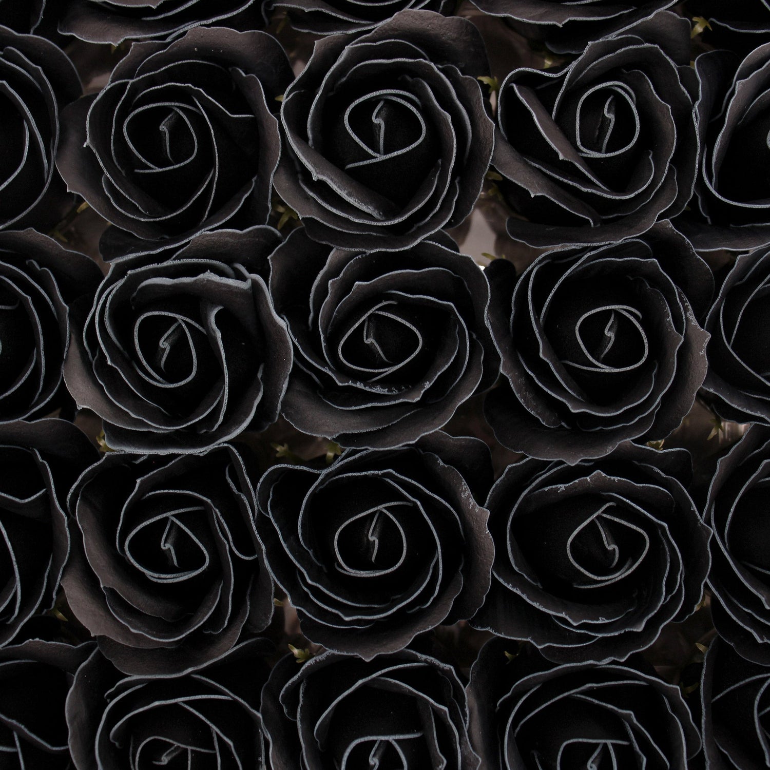Sammetstunna rosblommor, djupt svarta med en mjuk blek kant, krullar sig i täta rosetter med en matt finish. Lägg dem i en skål så pryder de rummet som riktiga blommor; rör vid kronbladen med vatten så mjuknar de till en mild tvål. 🌹