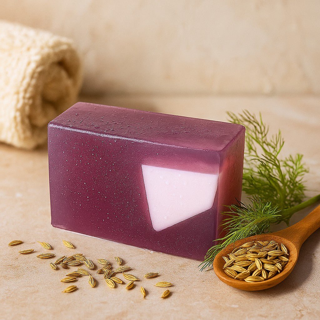 En glansig violett tvål ligger lätt i handflatan, dess lutande topp fångar ljuset och en mjuk vit infällning glider under tummen. När vatten möter den, vecklas en örtig sötma ut — söt fänkål varm och ljus — med en mild, nötaktig viskning från jojoba. En liten daglig ritual som lugnar sinnena och mjukar upp dagen. 🌿💜