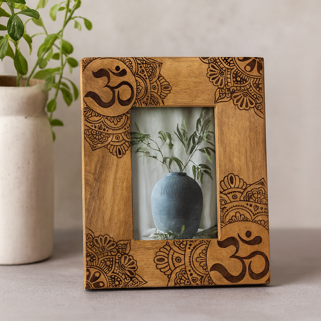Tillverkad i en ljus till medelmörk naturlig ton, har denna rektangulära ram en slät yta med mörka, graverade detaljer: mjuka blommiga mandalamönster och subtila Om-symboler som sitter mjukt nära hörnen och nedre kanten. Profilen är enkel och rak, med en ren inre kant som låter bilden andas. Fristående med ett ställ på baksidan, står den lätt på en hylla eller skrivbord och passar många inredningar — från minimalistisk till eklektisk. Passar 13×18 cm tryck (total ram ca 28×23×2 cm).