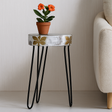 Den runda träytan bär en mjuk vitkalkad patina, dess penseldrag försiktigt synliga för ögat och släta vid beröring. Ställd på smala svarta metallben i hårnålstil känns pallen stadig och lugn — en mångsidig pjäs som för in enkelhet, stabilitet och tidlös design i vardagen. Dess närvaro är förankrande, dess ton varm. 🌿