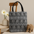 Den svartvita trycket ger en ren kontrast och lugn fokus. Fin linjearbete bildar symmetriska horisontella band—elefantmotiv som alternerar med geometriska diamanter och trianglar—vilket skapar en balanserad rytm över ytan. Tyget känns mjukt men tåligt, med prydliga sömmar och två långa axelremmar för bekväm bärning. Dess porträttform är rymlig utan volym, med en bred öppning för snabb åtkomst till dina nödvändigheter—marknadsfynd, anteckningsböcker, ett lätt lager och de små ritualer du håller nära.