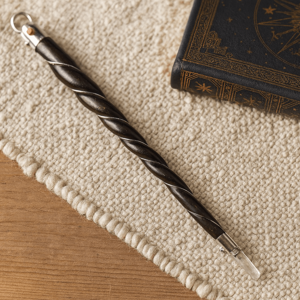 En meningsfull följeslagare för medvetna stunder och avsiktligt leverne, denna extra stora stav vilar stadigt i handflatan. Tillverkad i Indien, är det mörktonade träet polerat slätt, med en helixvridning som fångar ljuset när du vrider på den. Silverfärgade beslag ramar in formen; en mjuk, genomskinlig ändkåpa skyddar ytor när du ställer ner den. 🌀