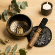 🔔 Kallt, handhamrat metall i handflatan, sedan ett klart surr som öppnar och dröjer kvar. Detta 14 cm stora sjungande skålset är en komplett ensemble för ljudhealing och medveten närvaro, tillverkat i Nepal och avslutat med graverade yogiska motiv som hedrar stadig praktik.