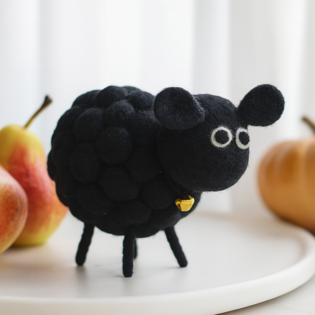 Derin, klasik siyah renkte doğal yün keçe kullanılarak şekillendirilmiş, yuvarlak gövdesi kümelenmiş keçe kürelerden oluşan, dokunmaya davet eden taş benzeri bir dokuya sahip. Kısa, silindirik bacaklar ve küçük yuvarlak kulaklı yumuşak şekilli baş, silueti kompakt ve neşeli tutarken, yuvarlak keçe gözler dostça bir bakış katıyor. Boynundaki altın rengi zil, mat yün üzerinde oyunlu bir parıltı sunarak kitaplıkta, masada, bebek rafında veya giriş masasında öne çıkan çarpıcı bir kontrast yaratıyor. Hafif ama sağlam, ahşap, keten ve seramikle güzel uyum sağlar ve cazibe dolu bir an için istediğiniz yere kolayca taşınabilir. 🔔