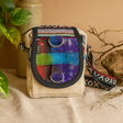 Nepal'de kenevir ve pamuktan dokunan gövde, siyah kenarlıkla çerçevelenmiş bej balıksırtı dokusuna sahiptir; kapak, mavi, mor ve yeşil tonlarında kaba dokuma renkler ekler. Kapak altında güvenli bir üst fermuar, gümüş tonlu D halkalar ve siyah, beyaz ve kırmızı desenli çıkarılabilir bir kayış bulunur. İçeride, birden fazla fermuarlı bölüm temel eşyaları düzenli tutar. Boyut: yaklaşık 14,5 x 15 x 4 cm. 🧵