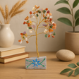 İnce bir ağaç, ham taş tabandan yükselir, altın tonlu tel gövdesi cilalı değerli taşlarla süslenmiş narin uçlara dallanır. Renkler, sıcak kırmızılar ve turuncular, taze yeşiller, huzurlu morlar, berrak ve dumanlı tonlar arasında yumuşakça değişir—ışığı sessiz, doğal bir parıltıyla yakalar. ✨