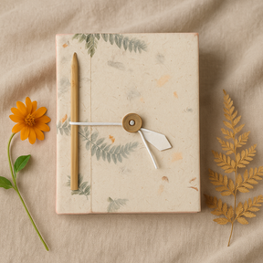 Parmaklarınızın ucunda, el yapımı lokta kapak yumuşak dokulu ve detaylarla dolu canlı bir his veriyor—gerçek kurutulmuş çiçekler ve yapraklar sıcak, krem renginde kağıda preslenmiş, sırt boyunca hafif bir pembe tonla çevrelenmiş. Her parça doğal olarak benzersizdir. 🌸