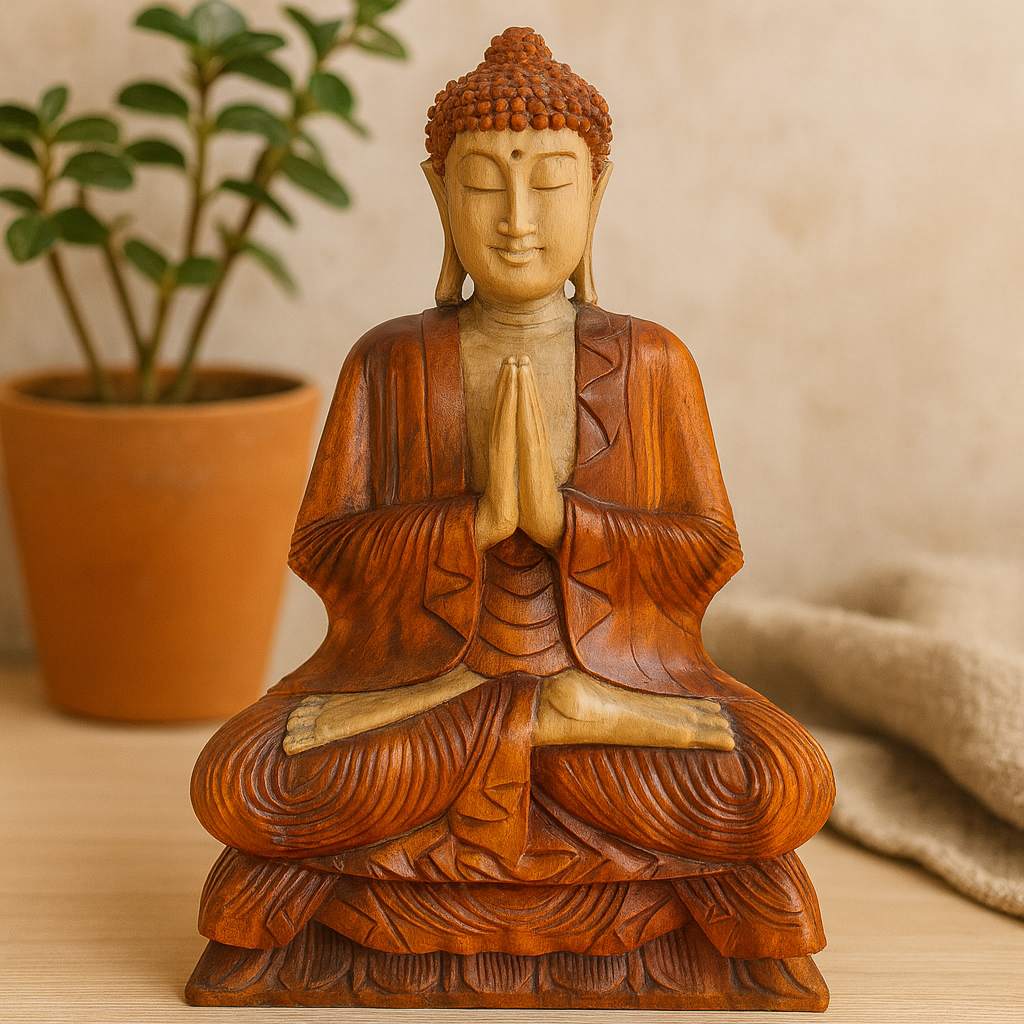 Buda, Anjali mudra ile kalpte avuçları birleştirilmiş lotus pozisyonunda oturuyor—bir selam ve saygı jesti. Katmanlı cübbeler ince, çizgisel oyuklarla tanımlanmıştır; huzurlu yüz kapalı gözlerle ve uzamış kulak memeleriyle dinlenir. Saçlar yuvarlak buklelerle dokulu ve yükseltilmiş bir topuzla tamamlanmış, alın ise küçük dairesel bir işaretle süslenmiştir. Alt cübbe entegre bir taban oluşturur, silueti dengeli ve sabit tutar.