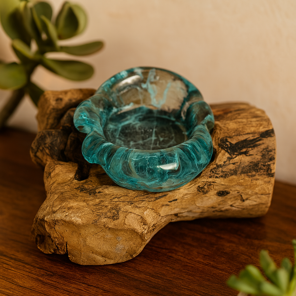 Şeffaf, el şekli verilmiş cam, doğal gamal ağacının konturlarına oturur, erimiş ve damarların sessiz buluşması. Soluk aqua tonu ışığı yumuşatırken, ahşabın toprak tonları ve daha koyu, ateşle öpülmüş lekeleri parçayı sağlam tutar.
