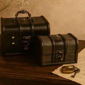Her kutu, dikdörtgen tabanlı ve hafif kubbeli kapaklı, sandık esintili tasarlanmıştır. Kontrplak gövdesinde kömür siyahı ahşap damarları, eşit perçinlerle süslenmiş koyu bantlarla buluşur ve yumuşakça eskimiş, eski dünya hissi verir. Eskitilmiş pirinç tonlu donanımlar görünümü çerçeveler—ön mandal menteşeli kapak ve ince yaprak motifleriyle, ayrıca ritim ve doku katan koruyucu köşe perçinleriyle. Takılar, hatıralar, kırtasiye veya anahtarlar için kullanın; düşünceli bir hediye sunmak için de harikadırlar. Üst üste yığılmış veya yan yana düzenlenmiş, gösterişsiz bir varlık sunarlar. Ton ve finisajdaki doğal varyasyonlar ile boyut, her seti sessizce benzersiz kılar. 💎