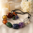 Yedi doğal değerli taş zarif bir spektrumda düzenlenmiş ve el düğümlü siyah makrome örgüsünde tutulmuştur: kırmızı jasper, karnelyan, sarı aventurin, yeşil aventurin, sodalit, ametist ve kaya kuvarsı. Her taş pürüzsüz ve cilalıdır, her kolyenin benzersiz olmasını sağlayan ince doğal inklüzyonlara sahiptir. Örgülü ip ciltte yumuşakça durur, görünür düğümler doku ve zanaatkarlık katar. Uyumlu tonlarda küçük bir tumbled charm kümesi yumuşak, oyuncu bir hareket sunar.