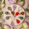 Parlatılmış, modern bir çerçeve içinde, kolye ucu çeşitli parlatılmış parçacıkları tutar—yumuşak morlar, şeftali pembeleri, derin kırmızılar, ipeksi bir parlaklığa sahip altın kahverengi bantlar, parlak çok renkler ve iridesan kabuk tonları—parlak, hafif kubbeli bir yüzeyin altında tutulur. Damla formu suyu yansıtır: birçok gelenekte berraklık, şefkat ve nazik bir serbest bırakma ve yenilenme akışını simgeler. Gümüş tonlu metal temiz sadelikle yansır; taşlar ve kabuk, dokunmayı davet eden toprak tonlu, okyanus öpücüğü dokusu ekler. 🌈