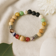 Tasarım, dokunma ve ton yoluyla bu ilkeleri yansıtır. Pürüzsüz açık kahverengi ahşap boncuklar sıcak ve topraklayıcı hissettirir, mat, gözenekli siyah bir boncukla eşleştirilir; bu, Palemahan'a bir gönderme yapar. Parlak beyazlar ve küçük altın vurgulu bir boncuk, Parhyangan için sessiz bir saygı duygusu sunar. Yumuşak kıvrımlı gümüş ve altın tonlu ara parçalar, parlak yeşillerden fasetli kırmızı ve mor tonlara kadar çeşitli dokular arasında yer alır — farklılıkların saygıyla buluştuğu Pawongan'un karşılıklı etkileşimini yansıtır.