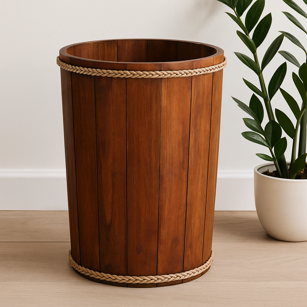 Dikey ahşap çıtalardan yapılmıştır, ahşabın doğal damarlarını ve nazik ton farklılıklarını gösterir. Yüzey, elde kolay hissettiren yumuşak bir parlaklıkla düzgünce bitirilmiştir. Çıtalar arasındaki dar boşluklar hafiflik ve havalandırma sağlar, kenar ve taban yakınındaki örgülü doğal lif bantlama ise ince bir doku ve el işçiliği katar. Sağlam ve dengelidir, günlük hayatı zarafetle karşılamak için yapılmıştır.