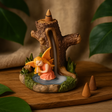 Burada koku manzara olur. Tacındaki altın tonlu fincandan duman, küçük bir şelale gibi iner, dokulu “kabuk” üzerinde katlanır, oyma yapraklar arasında yumuşakça birikir, sonra alçak, sis gibi bir örtüde durur. Form rustik ve organiktir—pürüzlü ağaç gövdesi, kesilmiş dal kalıntıları, tabanda yeşil yapraklar ve ışığı yakalayan tek saydam, kanat benzeri bir vurgu—böylece dumanın sürüklenişi evindeymiş gibi, sanki toprağa dönüyormuş gibi hissedilir. 🌫️