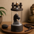 Şeffaf, silindirik bir odacık içinde, küçük bir kaidenin üzerinde koyu renkli bir ejderha yükselir ve geri akış şelalesi başlar. Duman, nazik bir şelale gibi düşer, heykelin etrafında birikir ve kıvrılır, ardından alçalarak süzülür—ipeksi, yavaş ve büyüleyici. Dokulu bir yatay çubuk iki direk arasında durur, üst ve taban hafif bir tuğla motifiyle çevrilidir; gölge ve şeffaflık arasındaki kontrastlar akışı sessiz bir performansa dönüştürür. Birçok Doğu Asya kültüründe ejderha, canlılık ve iyi şansın saygı duyulan bir sembolüdür; burada ise ritüeliniz için sakin bir koruyucu olarak durur. 🐉