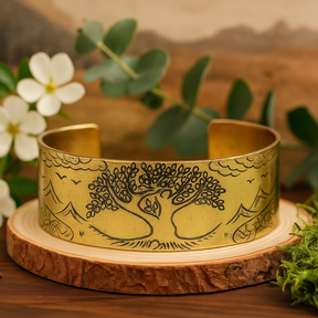 Eski yüksek yollar boyunca, keşişler ve yolcular basit bilezikler takardı—genellikle bakır, gümüş veya dokuma ipliklerden—kötü şanstan koruması ve geçiciliği hatırlatması için kutsanmış; bu parça, doğa oyma bandı ve yumuşak antikleşmiş oyuklarıyla o soyağacını yansıtıyor. Tibet kültüründe, böyle malzemeler denge, canlılık ve doğayla uyum için seçilir; bu pirinç manşet, sakin ve günlük bir varlık sunarken o niyeti onurlandırıyor. Kökleri ve dalları her iki yöne uzanan Yaşam Ağacı, bağlılık, büyüme ve yeryüzü ile gökyüzü arasındaki köprüden bahseder—direnç, farkındalık ve daha büyük bir şeye ait olmanın nazik bir hatırlatıcısıdır. 🌳