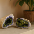 Uzun zaman dilimleri boyunca oluşan her kalkit jeode, kristallerin sakinlik içinde büyüdüğü boş bir taştır, bu yüzden hiçbiri birbirine benzemez. İçinde, yüzeyler mor ve altın tonlarında parıldar; bu iç kristaller, kontrastı ve derinliği nazikçe artırmak için boyanmıştır. Yumuşak ışıkta çevirin ve yüzeyler parlak vurgulardan gölgeli dokuya geçer. 🌥️