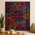 Pembe, mor, mavi, yeşil ve sıcak narenciye tonlarında parlak bir batik zemin, konsantrik bantlar ve düzgün çerçeveli iç dikdörtgen içinde düzenlenmiş derin siyah fil silüetleriyle buluşur. Düz siyah dış sınır paleti dengeler ve parçaya sağlam bir varlık kazandırır. Duvara asıldığında, yüksek kontrast uzaktan net okunur ve çarpıcı bir odak noktası oluşturur; yakından bakıldığında, pamuğun yumuşak dokusu ve benekli, mandala benzeri kompozisyon dikkatle incelenmeye davet eder.