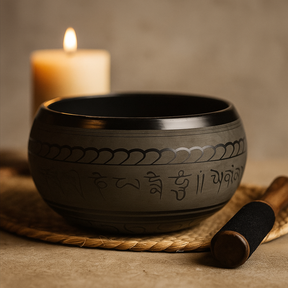 Serin, ağır metal avuç içinde durur; kalın, hafifçe genişleyen bir kenar, koyu kömür duvarları ve bronz-altın bantlar parlak siyah iç kısmı çerçevelerken ışığı yakalar. Nazik bir vuruş, derin, sabit bir ton açığa çıkarır ve kalır — zihni sakinleştiren ve ruhu merkezleyen bir ses kabı. 🔔
