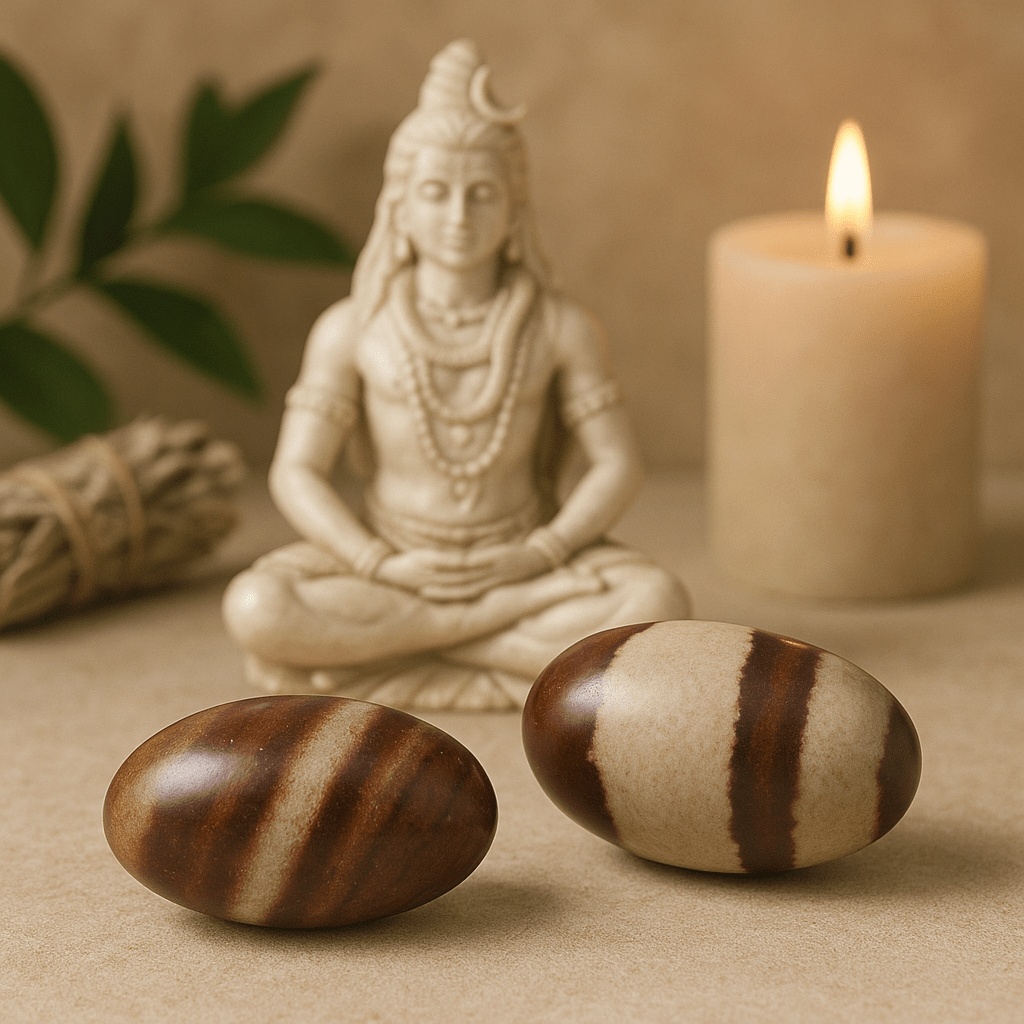 Avuç içinde serin ve pürüzsüz olan bu oval taş, nazik bir parlaklık taşır; toprak tonlarındaki kahverengiler, bedenin etrafını saran yumuşak krem tonlarıyla bantlanmıştır. Bu, Shiva Lingam — Lord Shiva'nın ilahi enerjisini ve Shiva ile Shakti'nin uyumlu birliğini onurlandıran kutsal bir Hindistan sembolüdür. Hindu geleneğinde dengeyi, yaratılışı ve kozmik enerjinin sessiz nabzını temsil eder. 🕉️